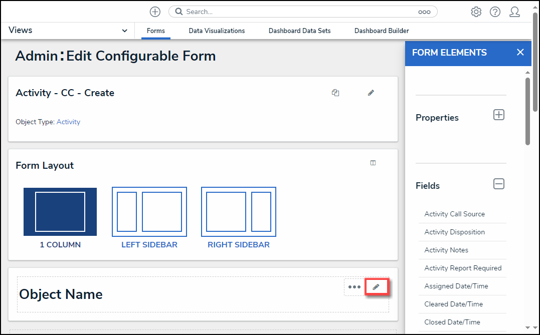 - From the Admin: Edit Configurable Form screen, click the Edit icon next to the Object Name.