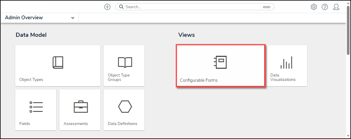 - From the Admin: Overview screen, click the Configurable Forms tile under the Views section.