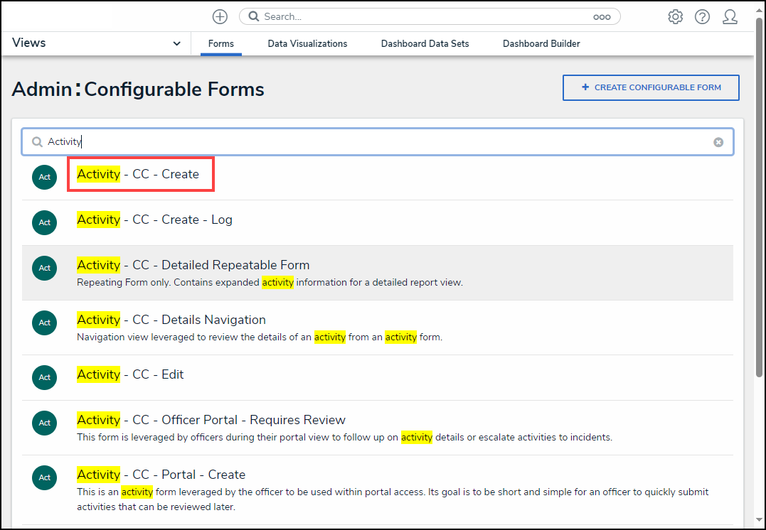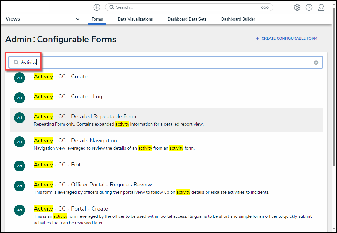- From the Admin: Configurable Forms screen, enter a keyword in the Search field to narrow the list of Forms.