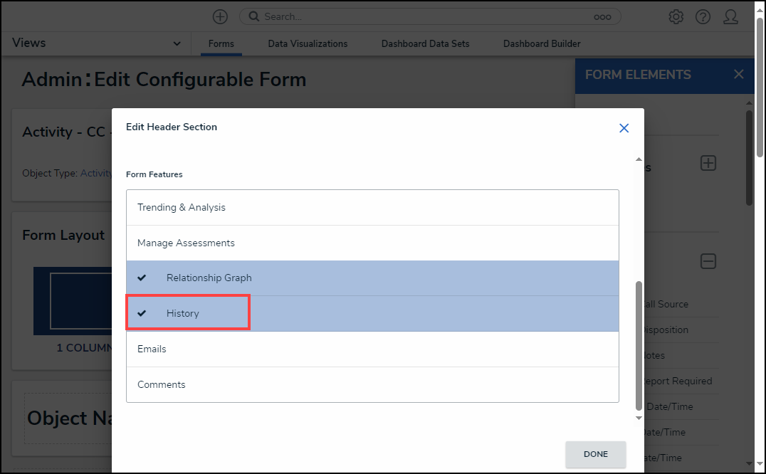 Before a user can access the History tab, an Administrator must enable it on an Object Form.