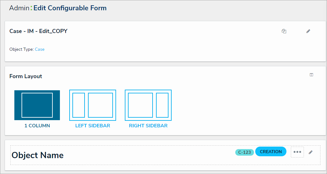 Newly duplicated forms are created with a _COPY suffix (e.g. creating a duplicate of a form called “New Incident” will create a new form called “New Incident_COPY”). You can edit the name and description for duplicate navigation and standard forms, and the elements and sections on a duplicate standard form, however, a duplicate form can only be associated with the same object type as the original form.