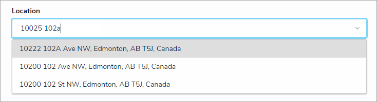 To add location data to an object through the address field, begin typing an address then select it from the results.