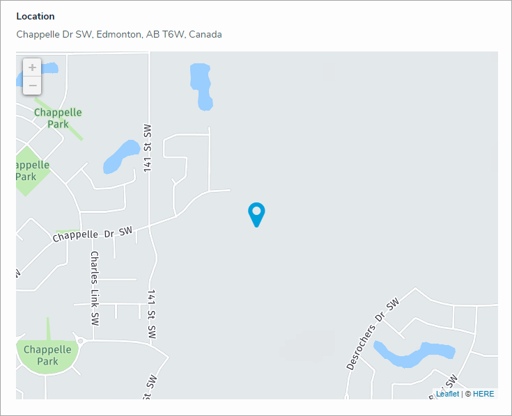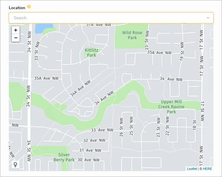 When both the address field and map are enabled, entering an address in the field will place a pin on the map, and placing or moving the pin on the map will automatically populate an address in the field. Note that it's possible to move or place a map pin on a location without an address (e.g., a field or lake); however, these locations may only populate partial or approximate addresses.