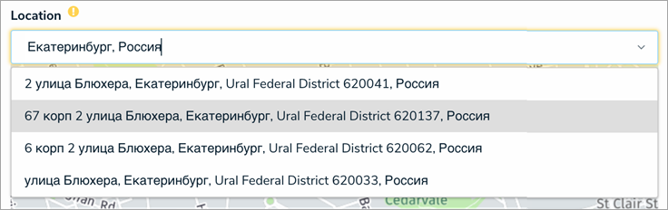 The Location field and map. Clicking a pin on the map will display its address and coordinates in a tooltip.