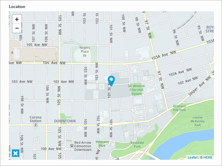 Dragging the pin allows you change the current location and clicking the pin will display the address and coordinates in a tooltip. Hovering your cursor over a pin will display a tooltip with address details. If the selected location has no address (e.g., a field or a lake), the tooltip will display the latitude and longitude coordinates. To remove the pin, click icon at the bottom-left of the map.
