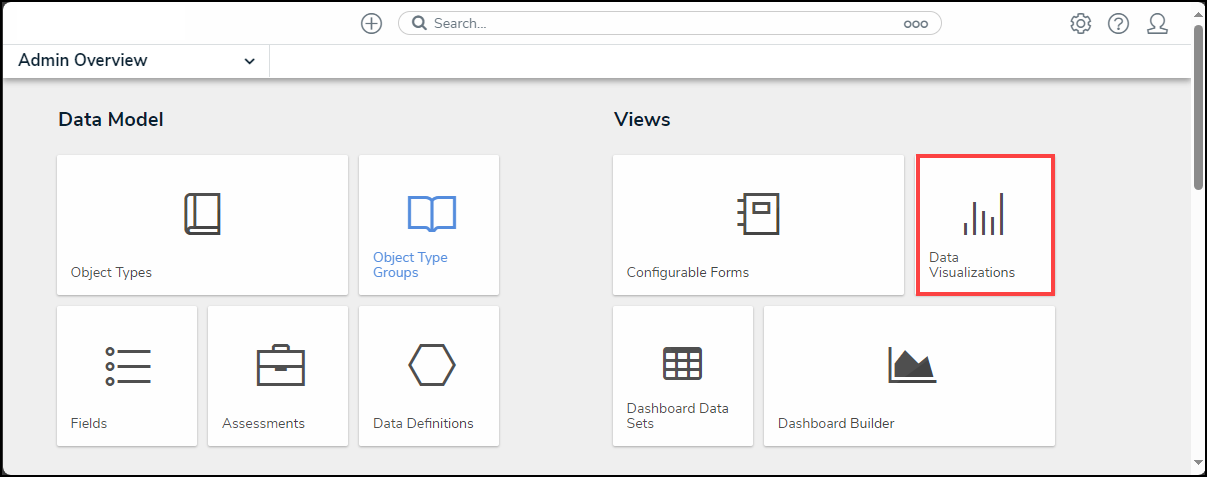 - From the Admin: Overview screen, click the Data Visualizations tile under the Views section.