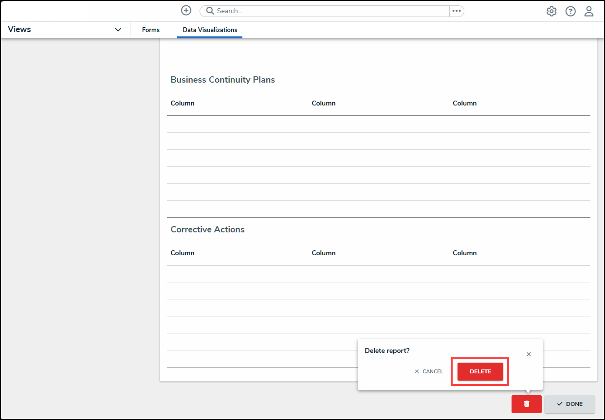 - From the Confirmation pop-up, click the Delete button to remove the report. Deleting a report will also delete any filters, parameters, and elements.