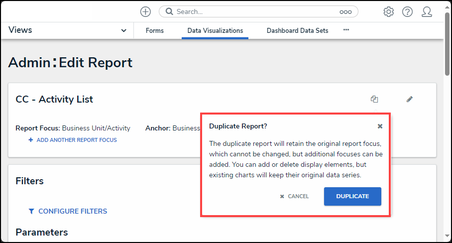 - A Duplicate Report Confirmation pop-up will appear, indicating that the duplicate report will maintain the original report focus, which cannot be change but can be added to.