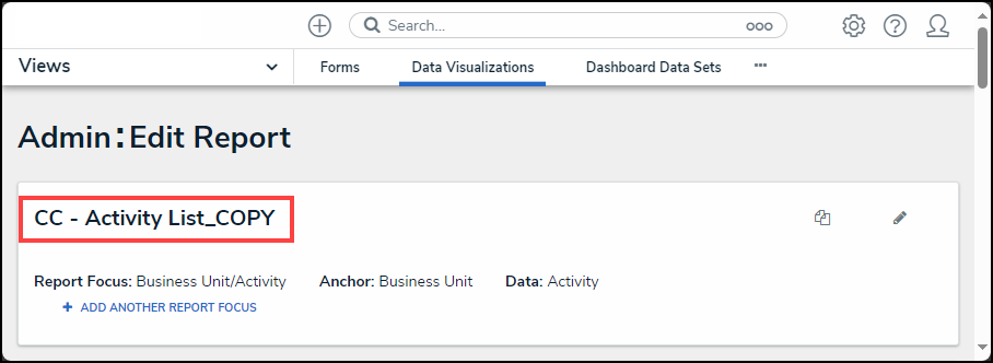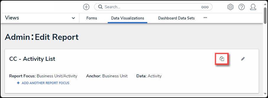 Administrators and Data Management advanced permissions users can create a copy of a Data Visualization Report by clicking the Copy Report icon on the Admin: Edit Report screen. The Copy Report icon allows users to create a copy of a report without having to create a new report from scratch.