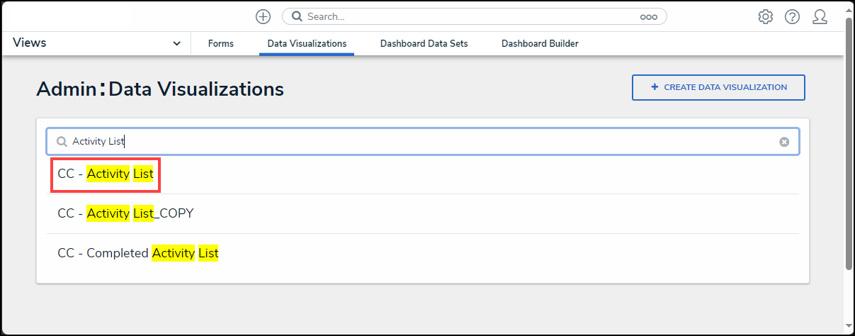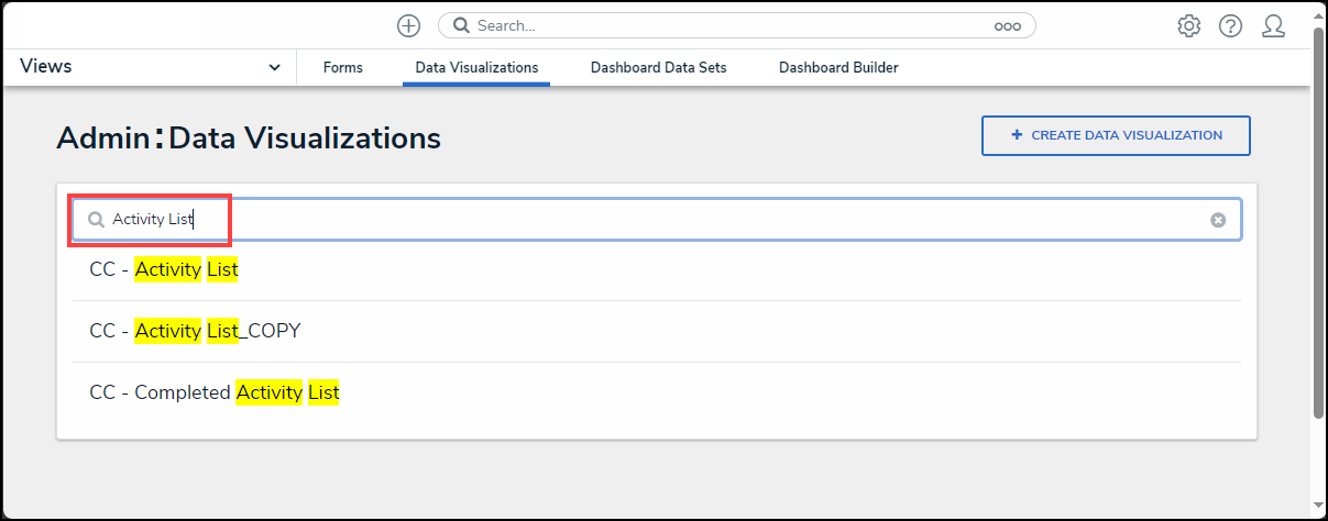 - From the Admin: Data Visualizations screen, enter a keyword in the Search field to narrow the search results list.