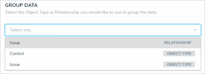 Optional: Select an object type or relationship from the Group Data dropdown menu. This selection will determine the legend to the left of the chart and the category of the data displayed. If the data is not grouped, a total count of the field, formula, or state selected in step 5 above will be displayed.