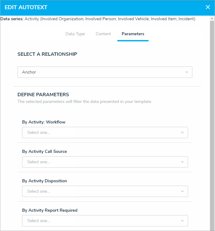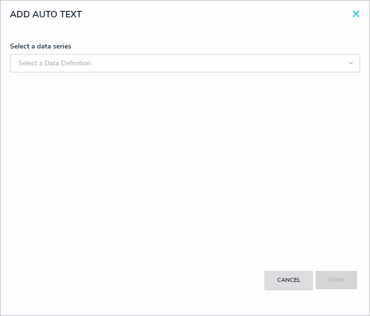 Select a data series from the Select a data series dropdown menu, then click Done. The data definition selected here will determine which object type data you can choose to display in the AutoText section.