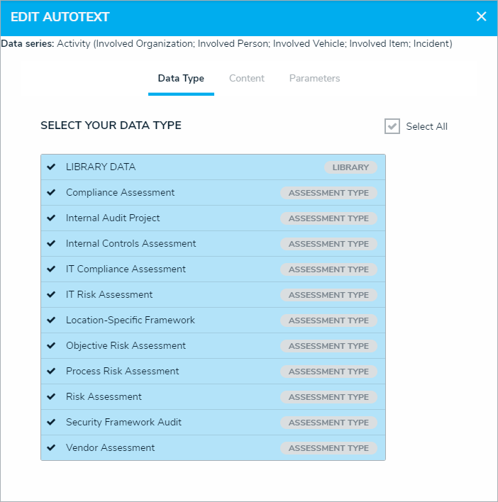 Choose the data types you'd like to display in the form from the Data Type tab. Selecting LIBRARY DATA will include object type data, while selecting an Assessment Type will include the assessment name and workflow state. By default, all data types are selected. To make individual selections, deselect the Select All checkbox, then click the data type(s) you wish to include.