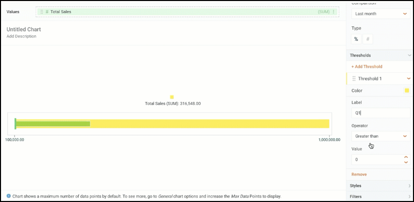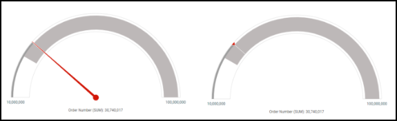 - Bullet Gauge: A Bullet Chart illustrates progress toward a threshold. The qualitative ranges are displayed as different colors that can be customized.