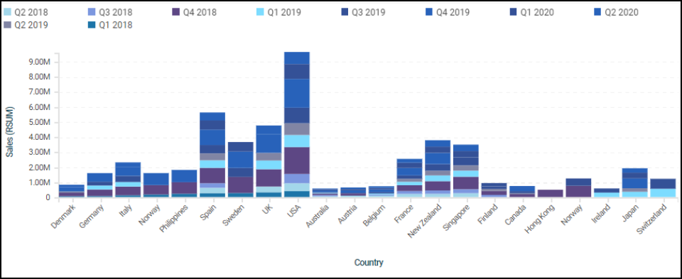 - Multi-series Bar Chart: Multi-series Bar Charts present a single value in more than one Category. Users must add a single Category, Value and Series field to create something similar to a Pivot Chart. A Multi-series Chart consists of two dimensions and a measure.