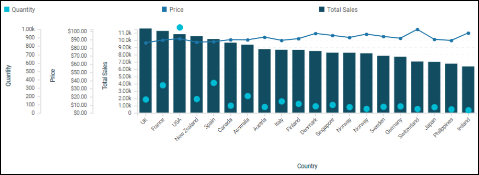 - Combo Chart: Combo Charts allow users to layer multiple XY Charts (Bar Charts, Line Charts, and Symbol Charts) in a single Chart. Combo Charts consist of one shared dimension or Category and multiple measures or Values and are used to compare different metrics grouped by the same category.