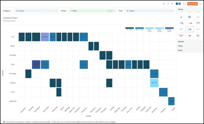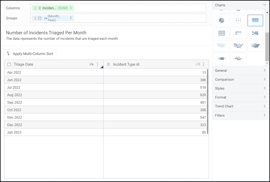 - Multi-series Line Chart: Multi-series Line Charts present a single value in more than one series (Categories). Users must add a single Category, Value and Series field to create something similar to a Pivot Chart. A Multi-series Chart consists of two dimensions and a measure.