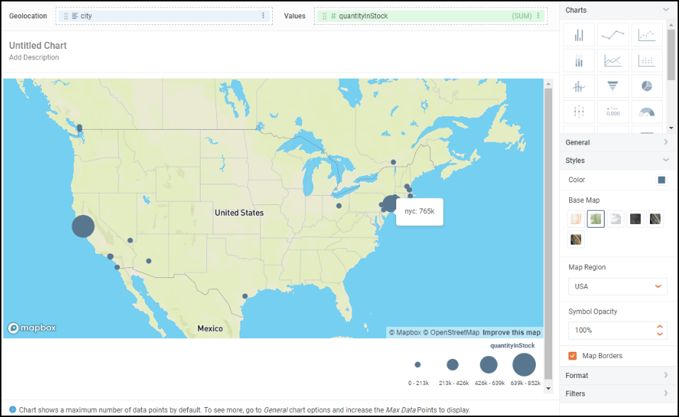 - Bubble Map: Bubble Maps show aggregated values in precise locations, with each bubble area proportional to the value represented (the higher the value, the bigger the bubble).