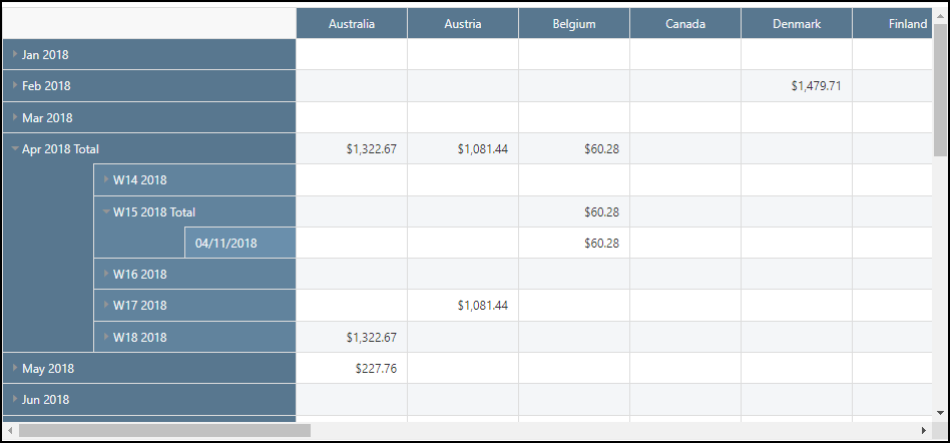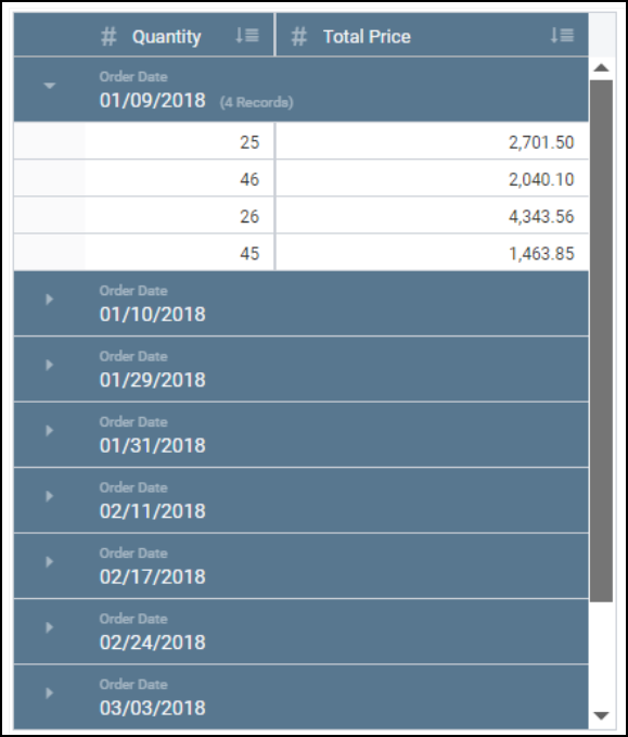 - Expanded Table: Expandable Tables group banded reports. Each row presents a distinct value from the grouping field with special formatting highlighting the value. The number of detail records associated with the grouped value is displayed in parentheses adjacent to the grouped values. Expandable tables are especially useful for organizing datasets with many rows, as multiple detail rows are collapsed by default.