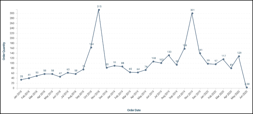 - Line Chart: Line Charts show changes in an aggregated value over a continuous dimension (Category), usually time. For example, a Line Chart shows the number of orders placed over time.