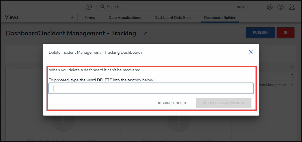 - A Confirmation screen will appear, indicating that when a Dashboard is deleted, it cannot be recovered and is a permanent action. Type the word Delete in the textbox and click the Delete Dashboard button to delete the Dashboard from the system.