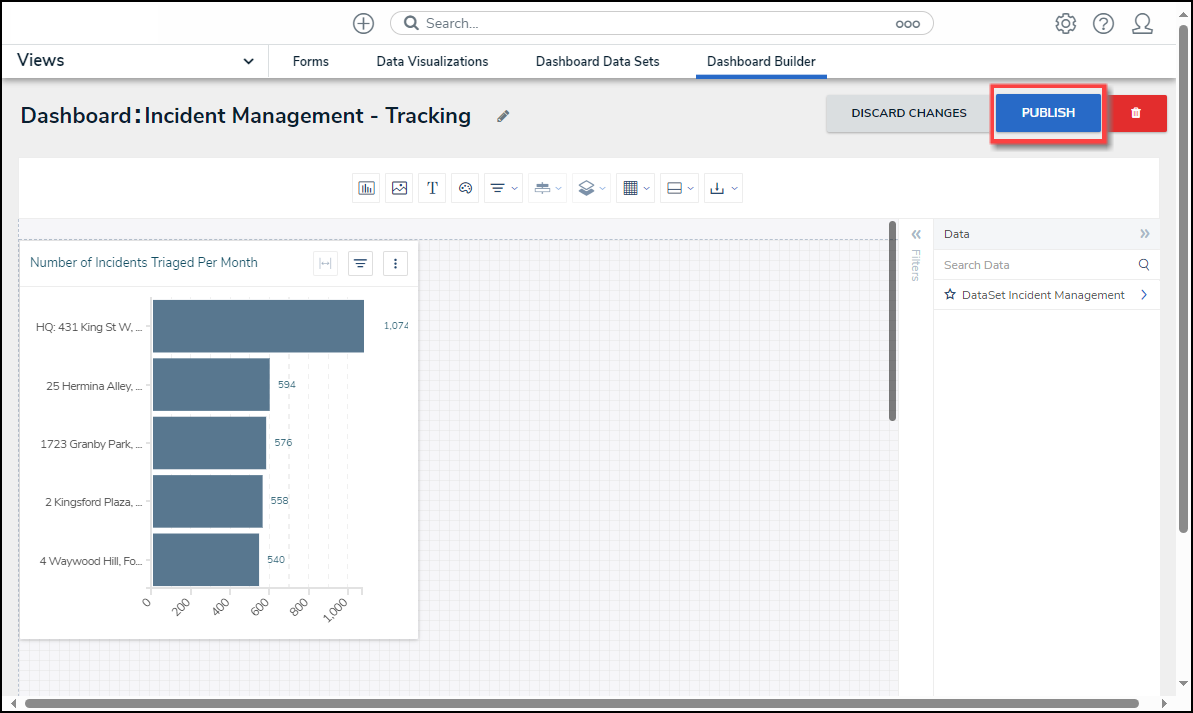 Administrators can publish a Dashboard when it is complete to allow other user access to the charts/reports within the Dashboard. Dashboards must be published to embed a Dashboard in a system Activity so users can view them.