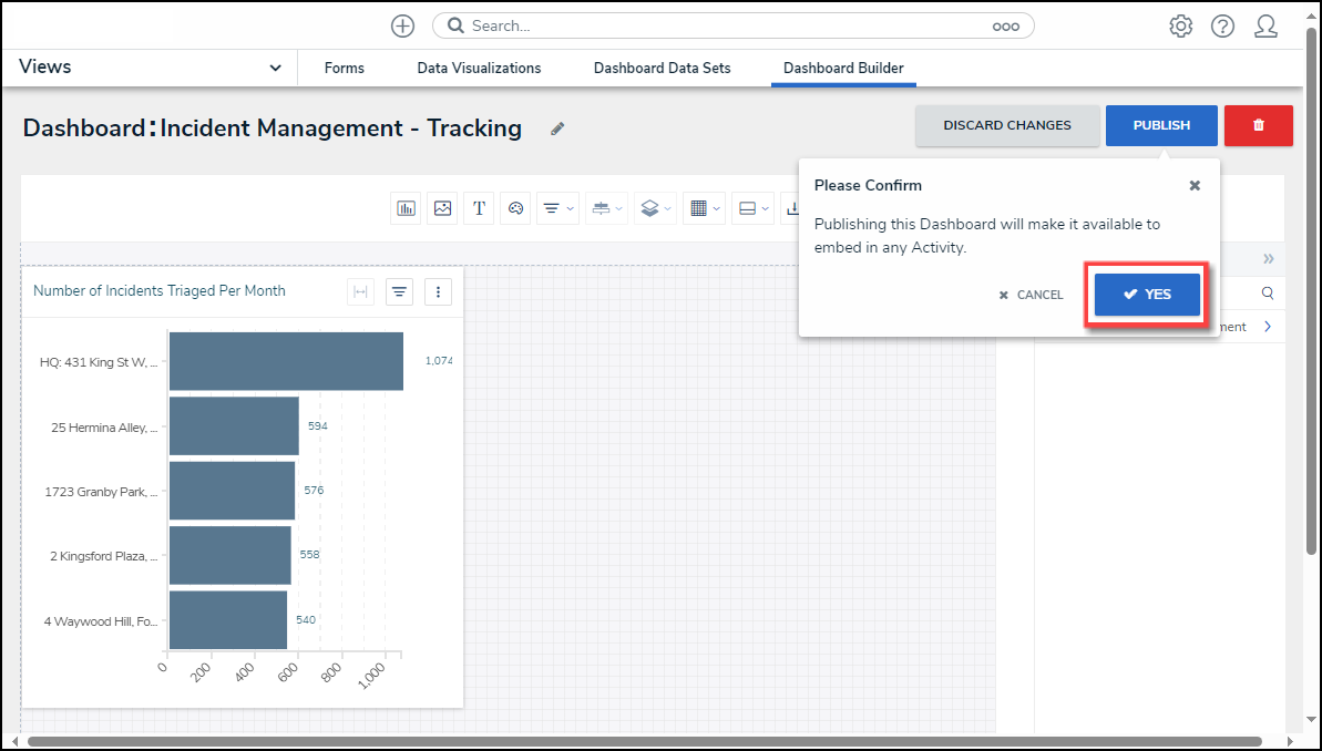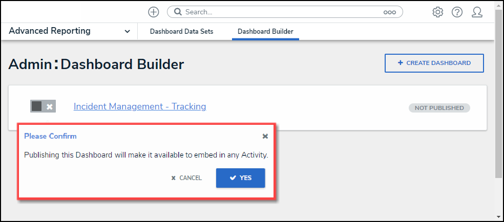 - From the Confirmation pop-up, click the Yes button to Publish the Dashboard.