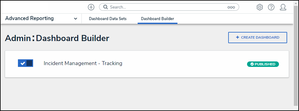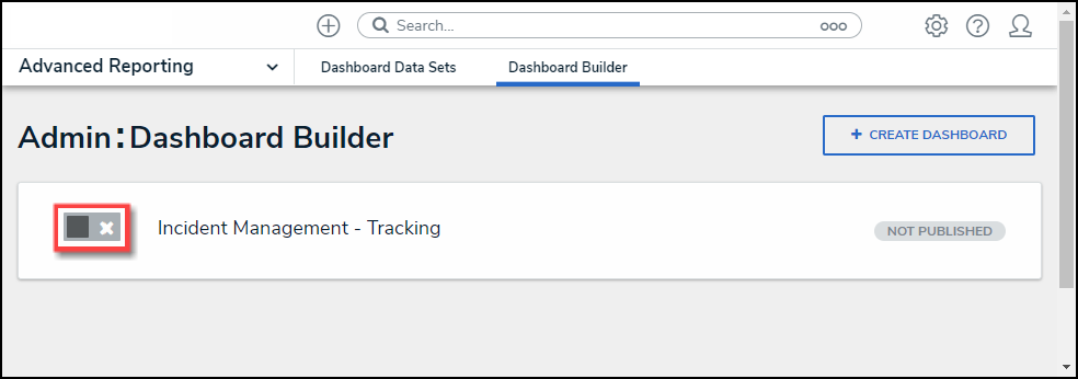 - From the Dashboard Builder screen, click on a toggle switch next to the Dashboard's Name.