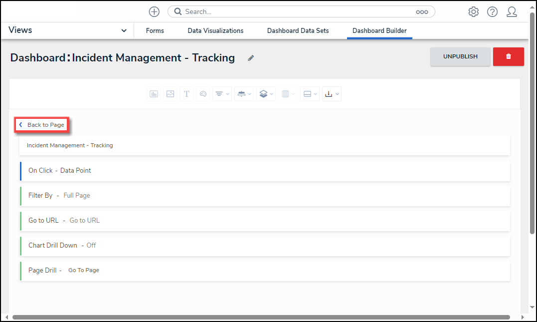 - After completing the Page Action configuration, click the < Back to Page link to save your changes and return to the Dashboard Builder screen.