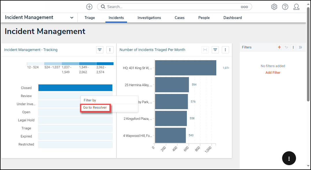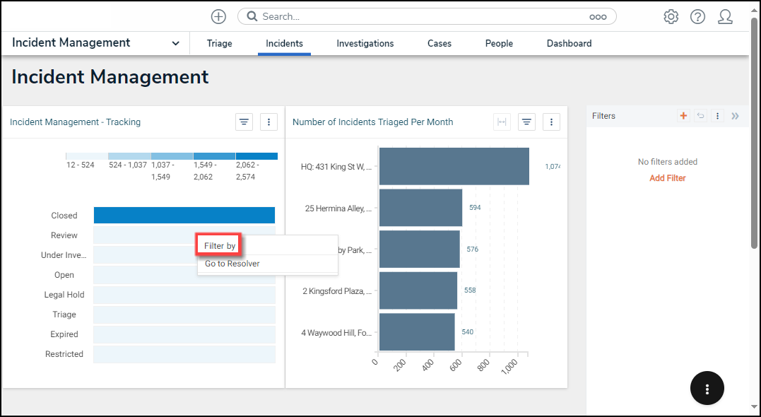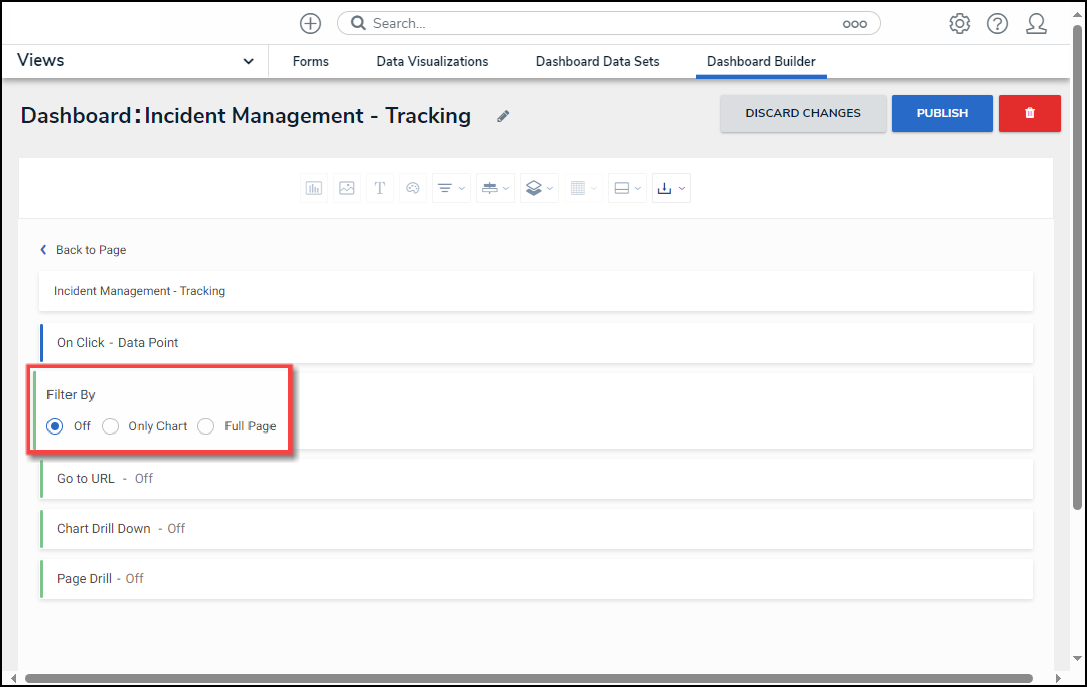 - The Filter By Option will appear on the Dashboard Builder and Dashboard Widget screens when a user clicks a Data Point on a Chart (Data Point) or clicks outside the Chart (Panel).