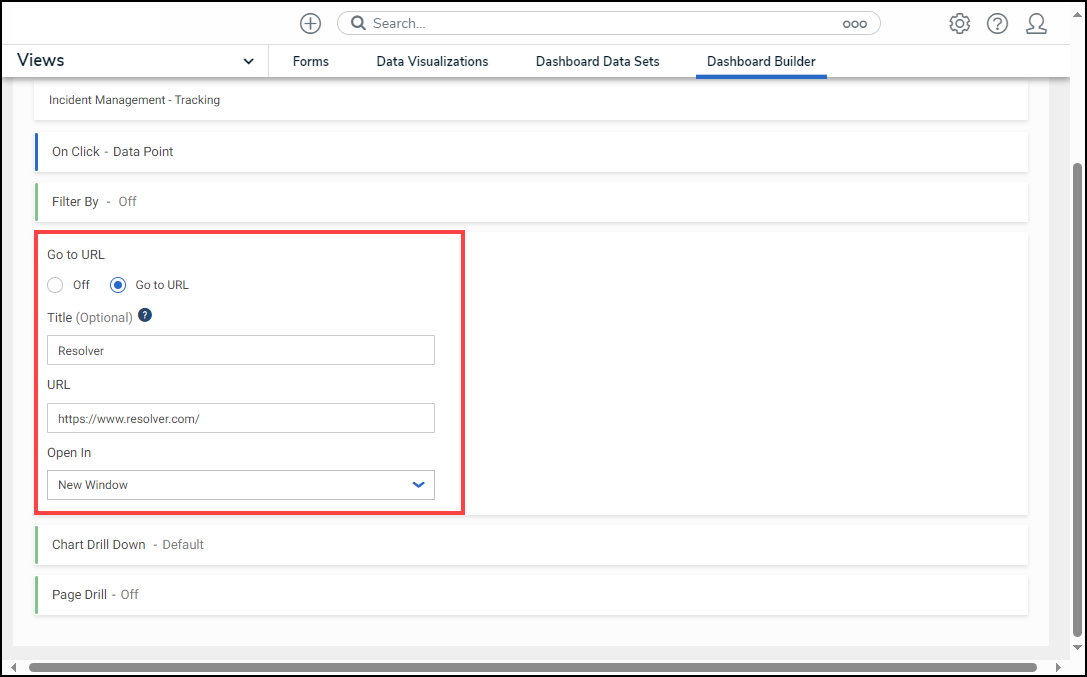 - The Go to URL will appear on the Dashboard Builder and Dashboard Widget screens when a user clicks a Data Point on a Chart (Data Point) or clicks outside the Chart (Panel).