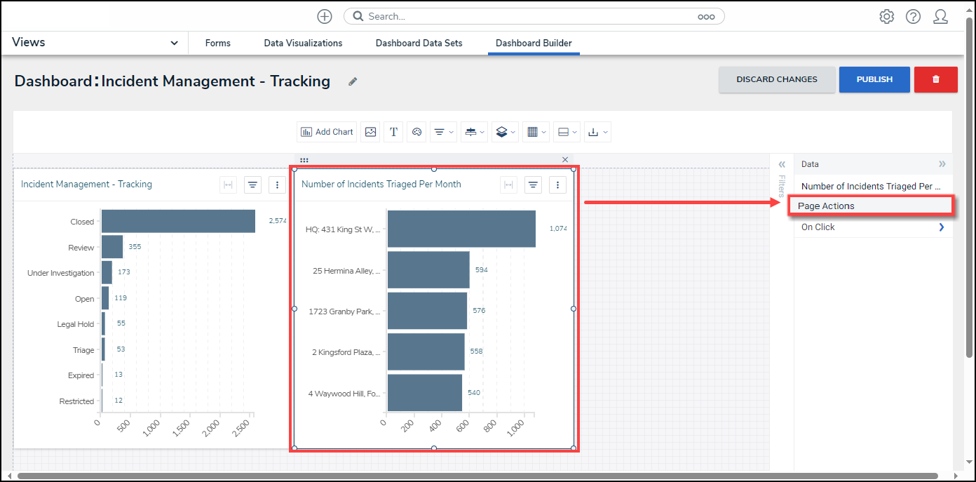 - From the Dashboard Builder screen, clicking on a Chart will activate the Page Action option under the Data Panel.