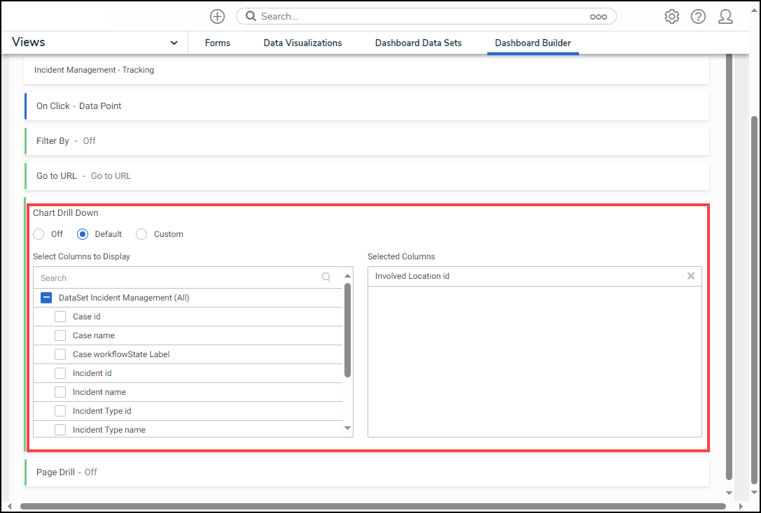 Default: The Default option allows a user to create Chart Drill Downs using the data columns from the selected Chart.