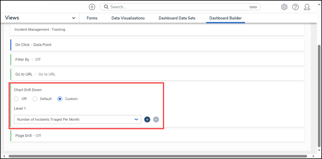 - Custom: The Custom option allows users to create a Chart Drill Down using the data from the Charts that appear on the Canvas on the Dashboard Builder screen. Users can add multiple drill-down levels based on the number of Charts on the Dashboard Builder screen. Click the Plus icon to add a Chart as a drill-down, and click the Minus icon to remove the Chart.