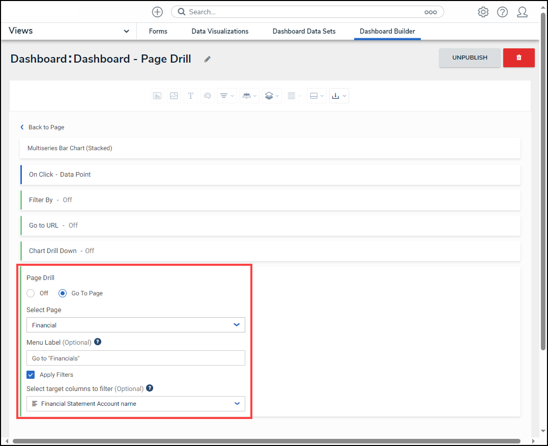 - Menu Label: Enter a custom Page Drill Title that will appear when clicking a Data Point or outside of the Chart panel.