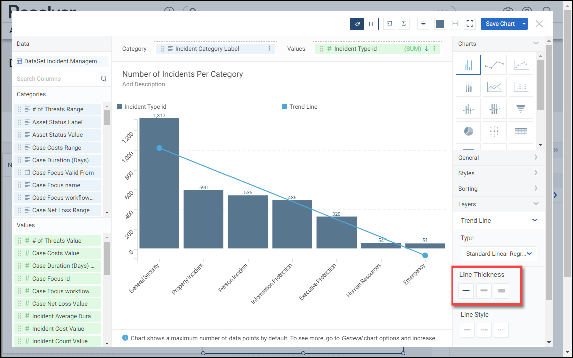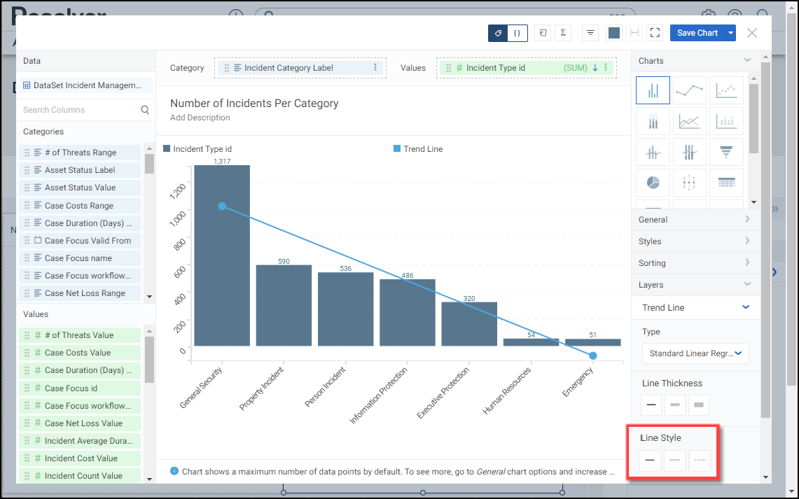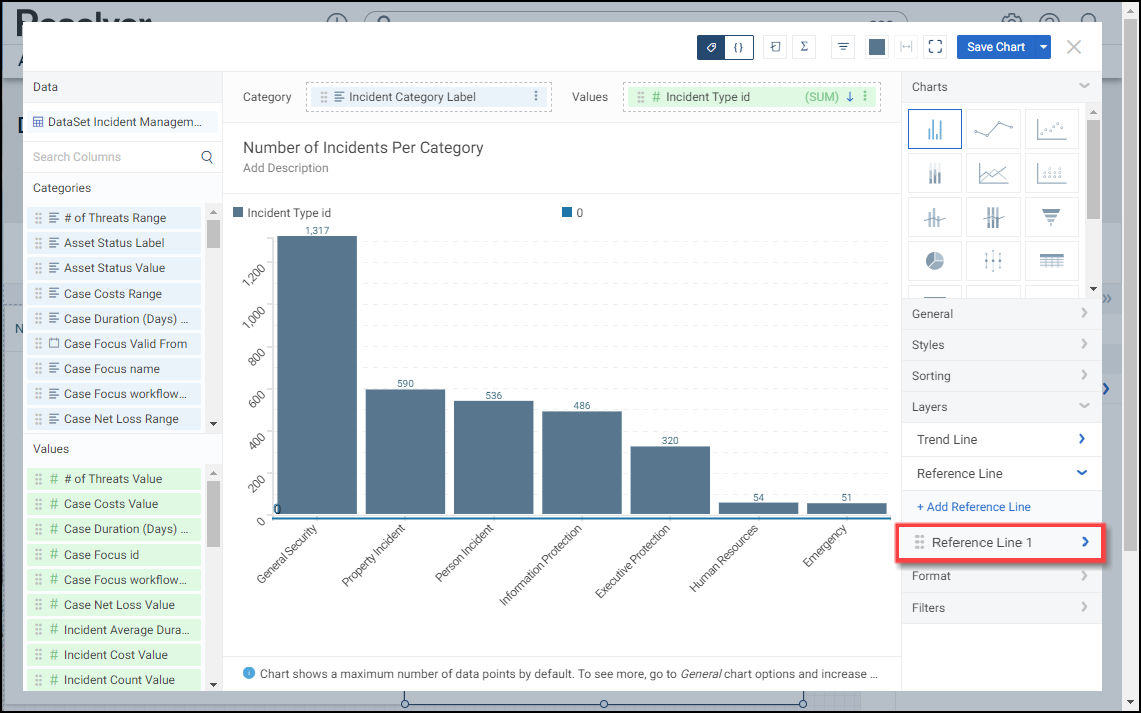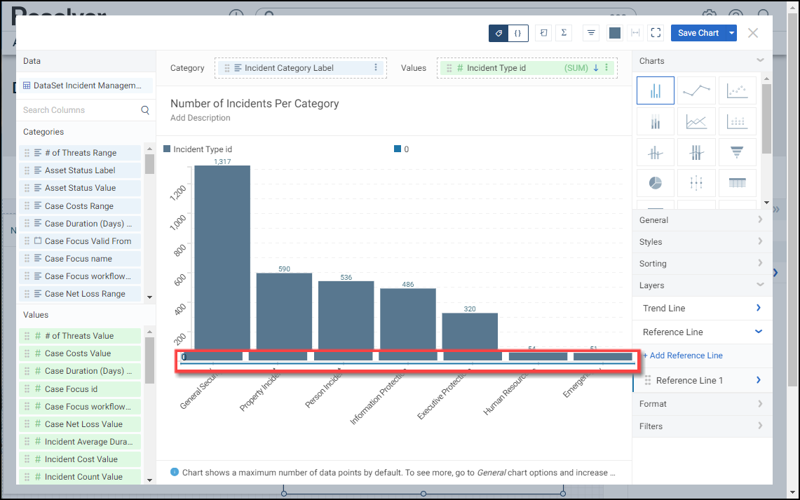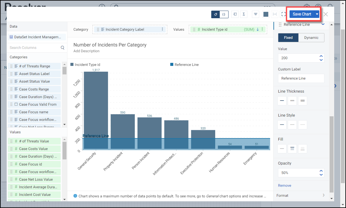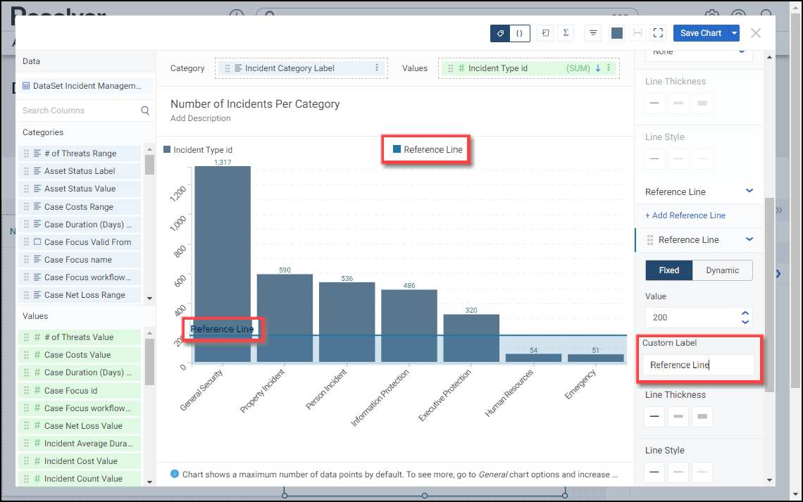 A Reference Line allows a user to create a line of reference on the Chart to measure, compare, or reference the data values. You can add multiple Reference Lines on a Chart.