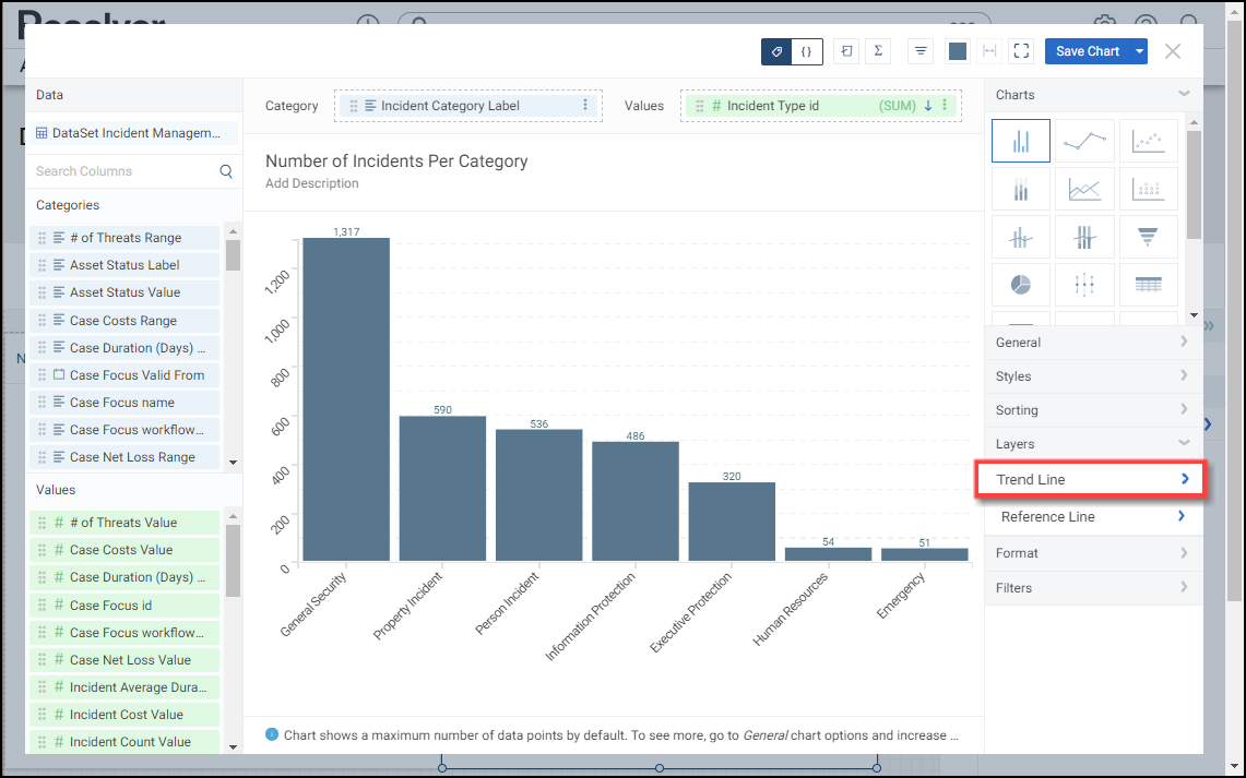 The Layers function on the Chart screen is available for most Chart Types. The Layers function allows users to set up Trends and Reference Lines over top of a Chart which helps predict future trends.