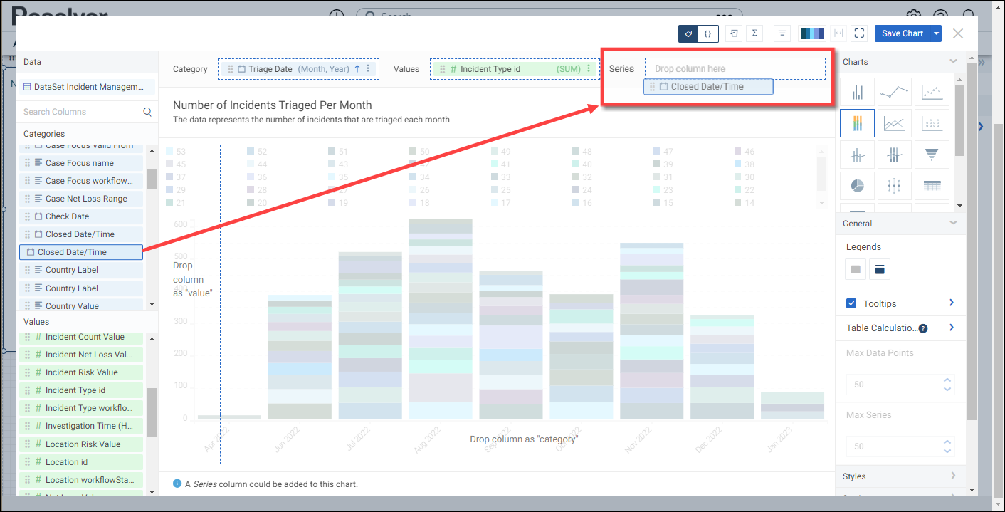 - Drag and drop a second Category from the Data Panel onto the Series field at the top.