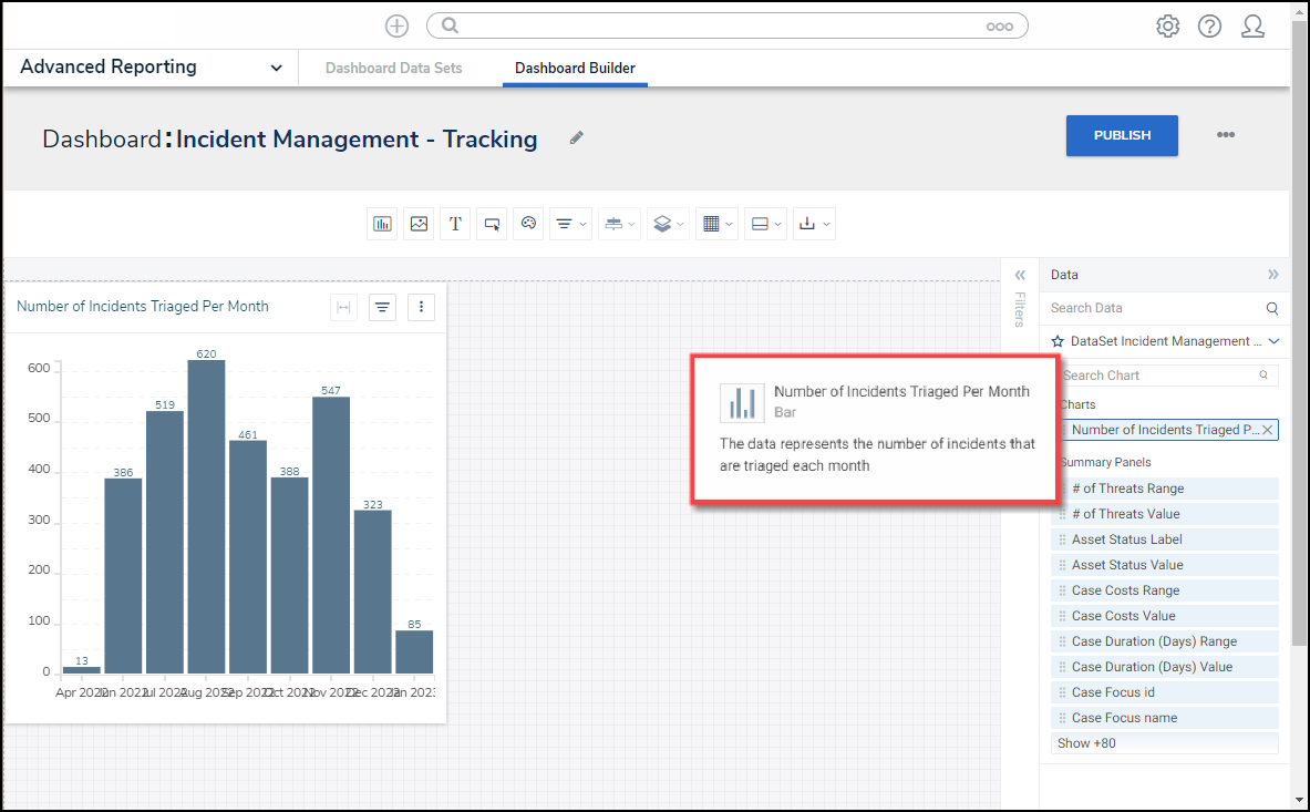 Resolver’s Dashboard Builder allows Administrators to build custom Dashboards using the Dashboard Data Sets published within their Org.