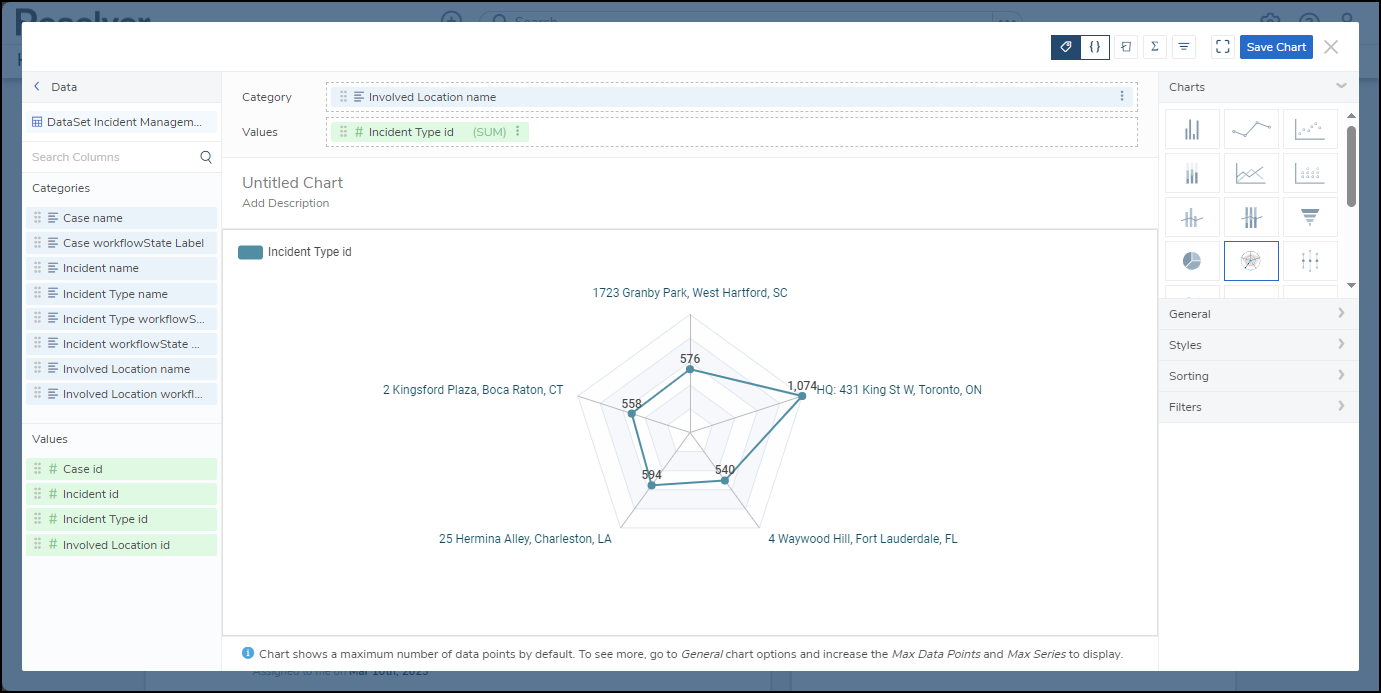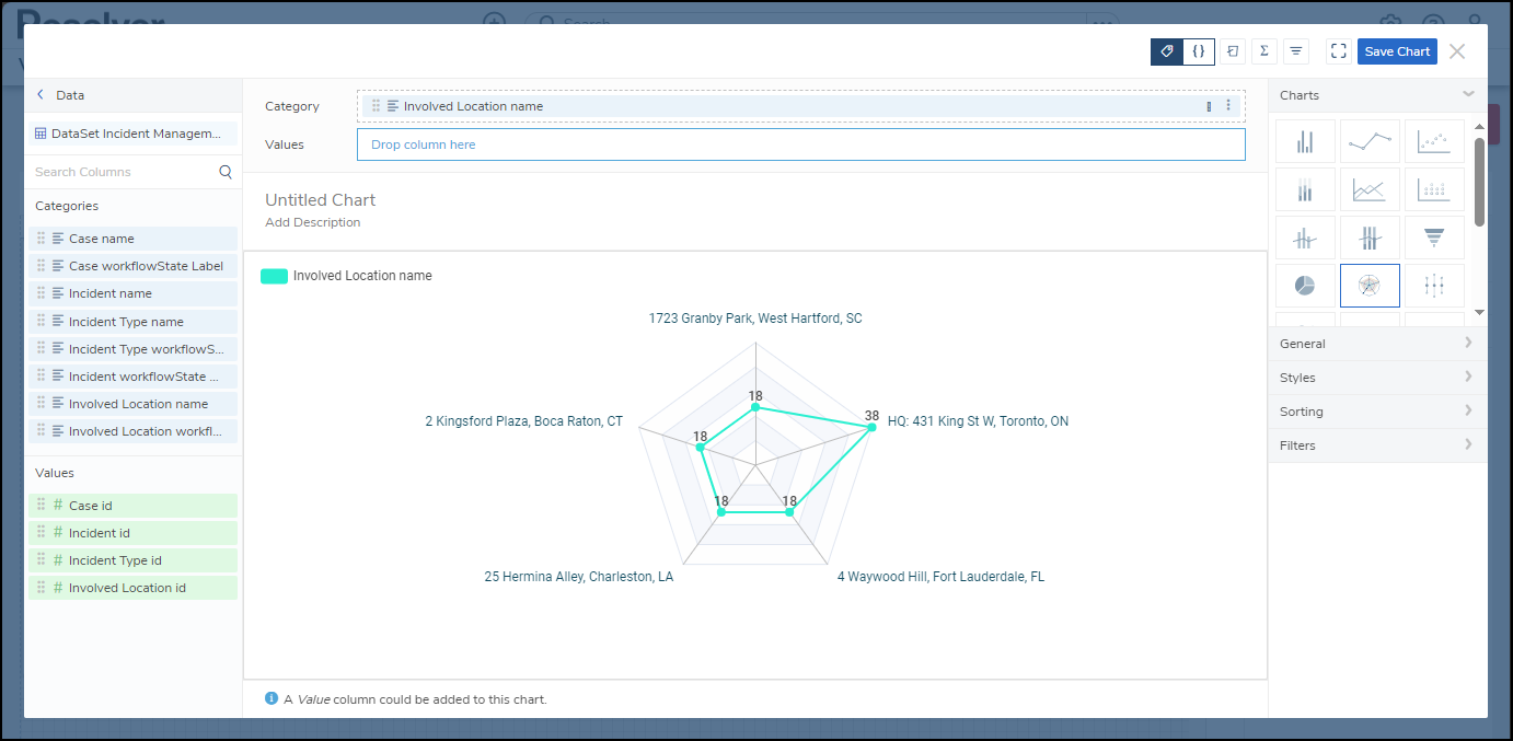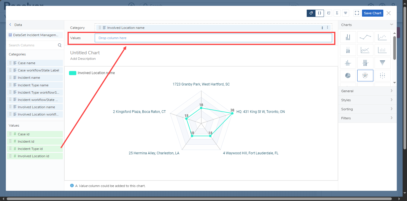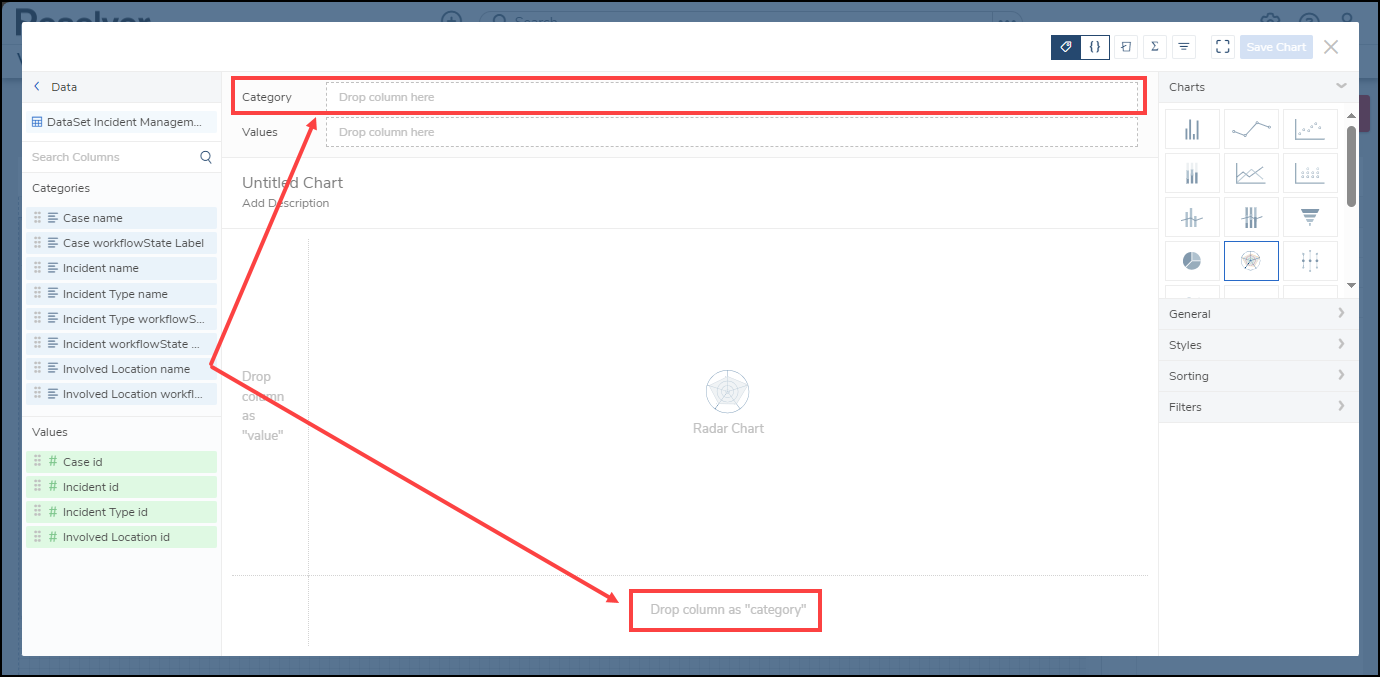 - The Radar Chart allows users to show objects on a polygon grid, depicting category values as poles and the value column aggregates for each category are points on the poles.