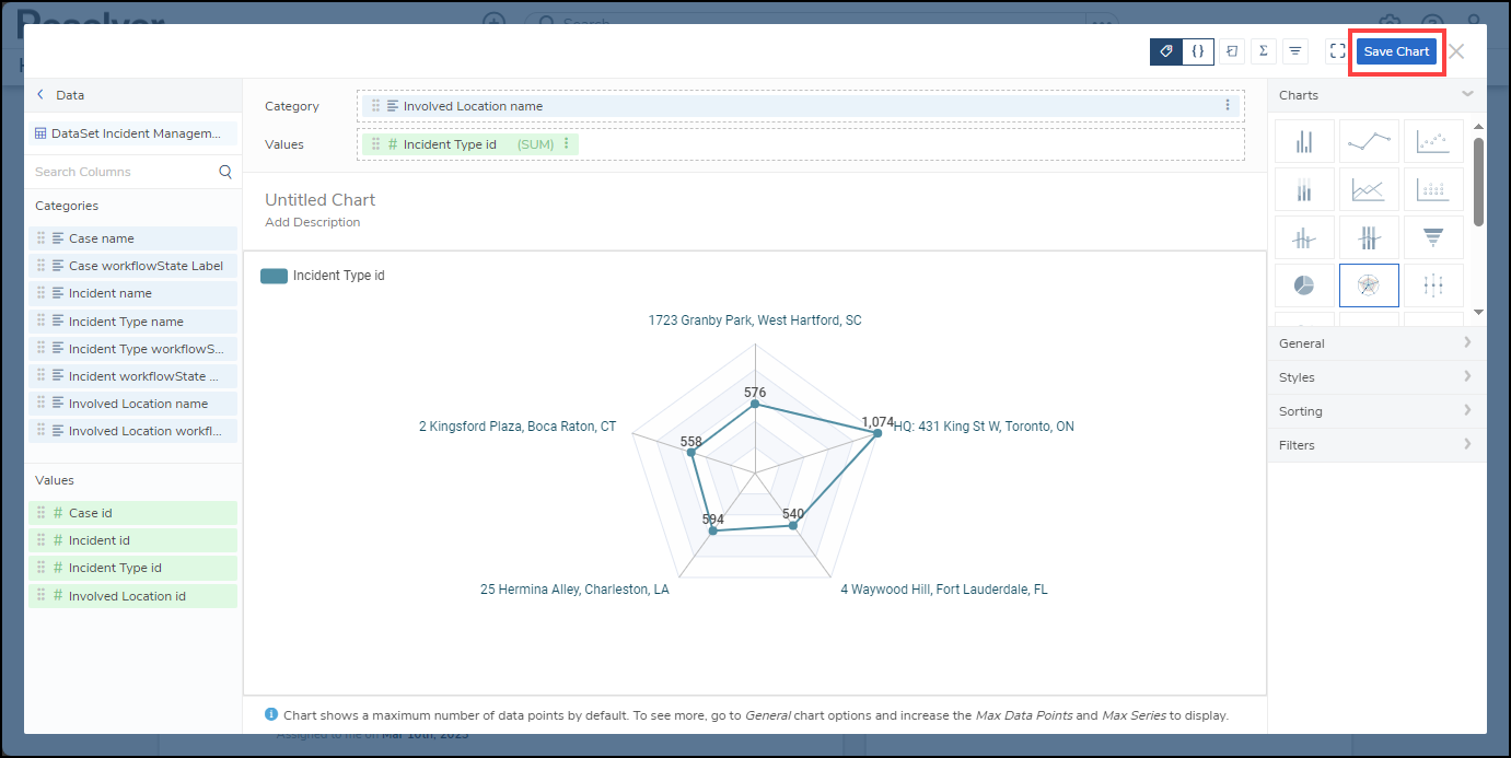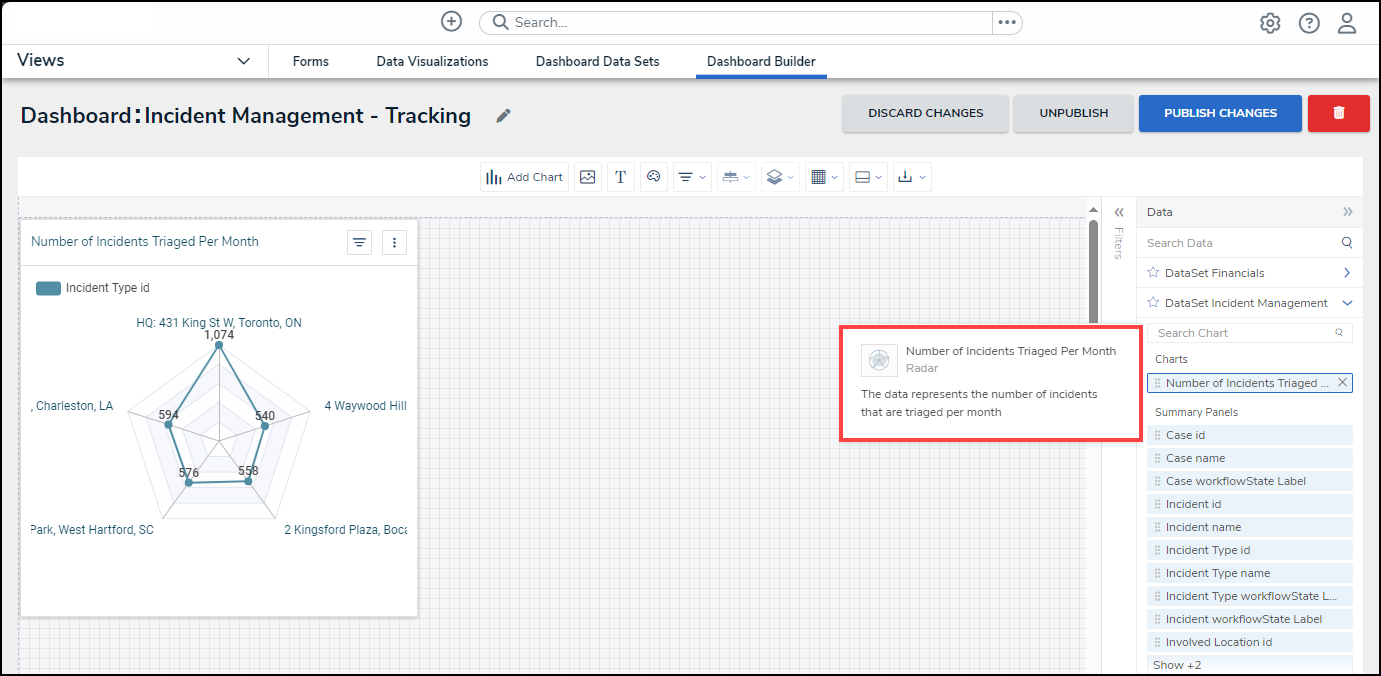 Resolver’s Dashboard Builder allows Administrators to build custom Dashboards using the Dashboard Data Sets published within their Org.
