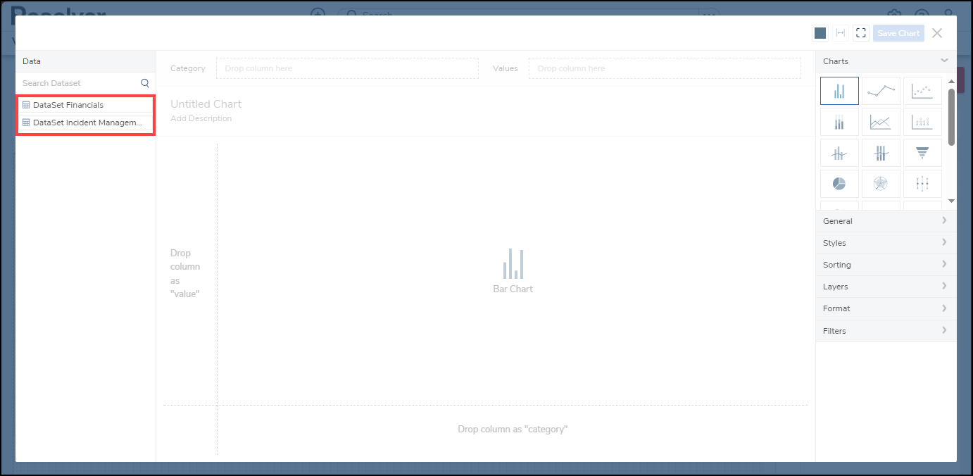 - From the Chart screen, click on a Dashboard Data Set from the Data Panel.
