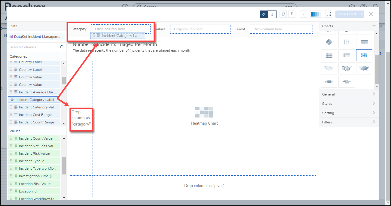 - (Optional) Drag and drop a Category or Value from the Data Panel onto the Values area on the left of the Chart or within the Values field. Data entered in the Values field is used as the Heatmap measure and is aggregated as needed.