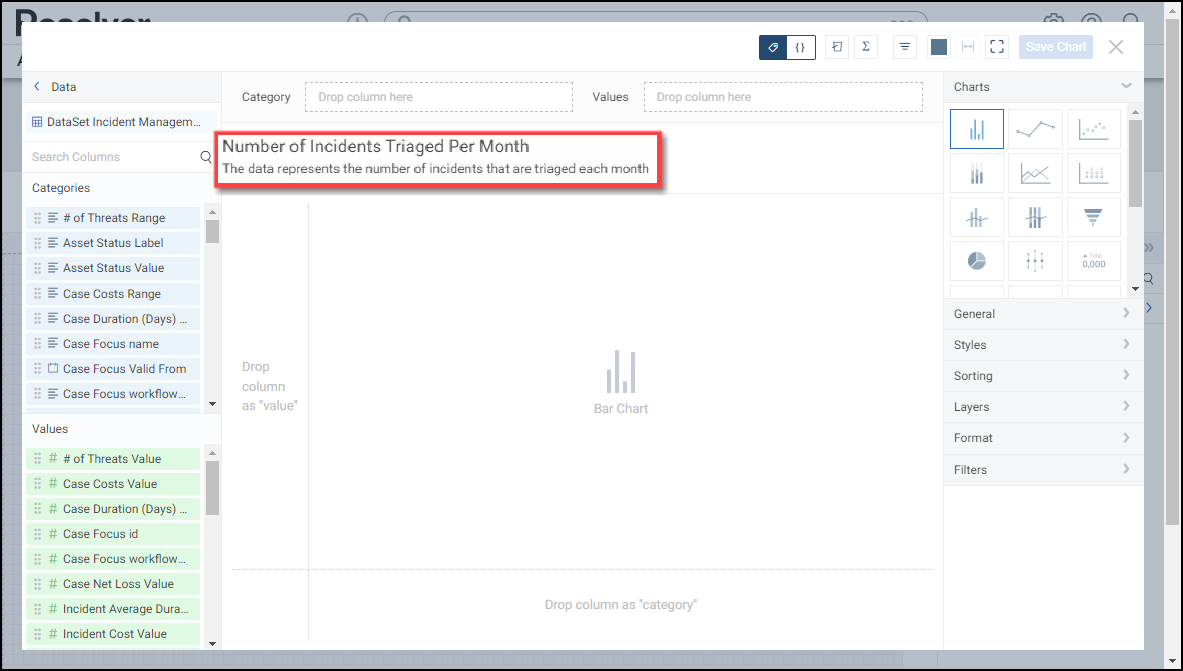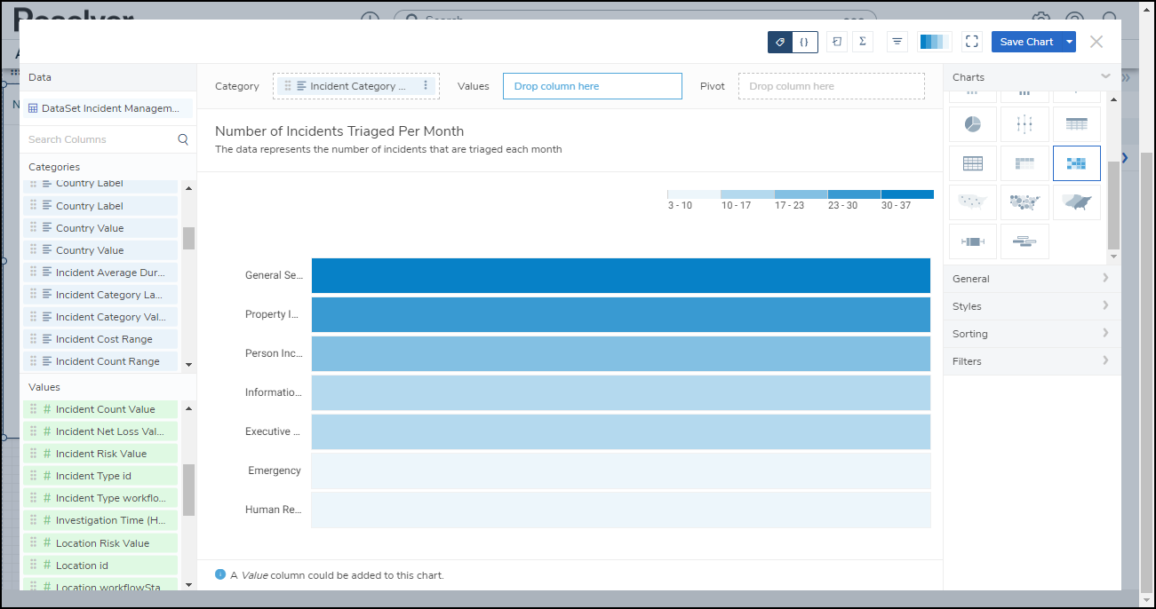 - The Category data will populate the Chart. Data will populate the Chart after adding a Category or Value that has data to the Chart.