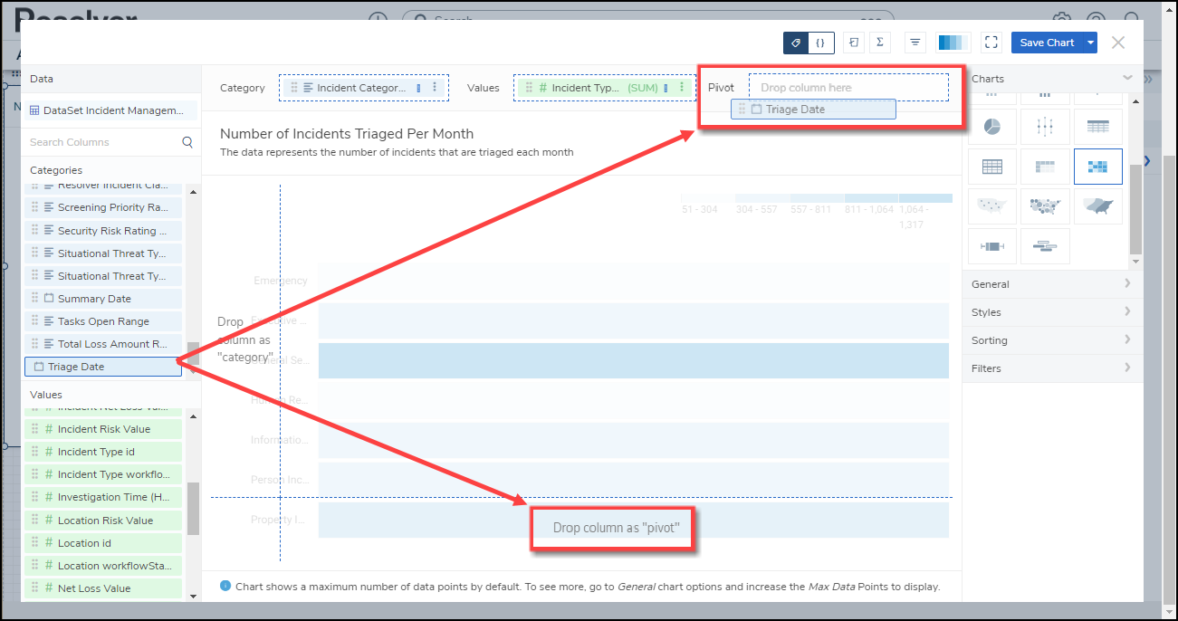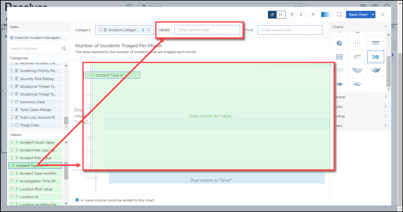 - Drag and drop a Category or Value from the Data Panel onto the Pivot area on the left of the Chart or within the Pivot field. The Pivot field summarizes the Category or Value data.