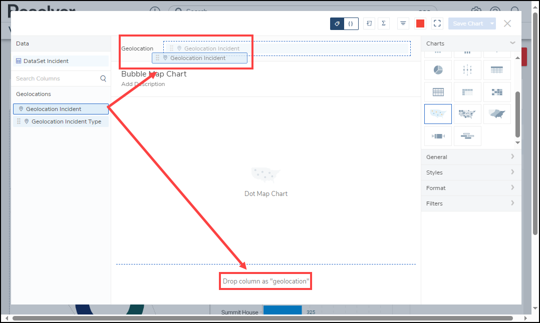 Before using the Dashboards feature, at least one Dashboard Data Set needs to be created and published. Geolocation data must be added to a Data Set to create a Map Chart using the Dashboard Builder.