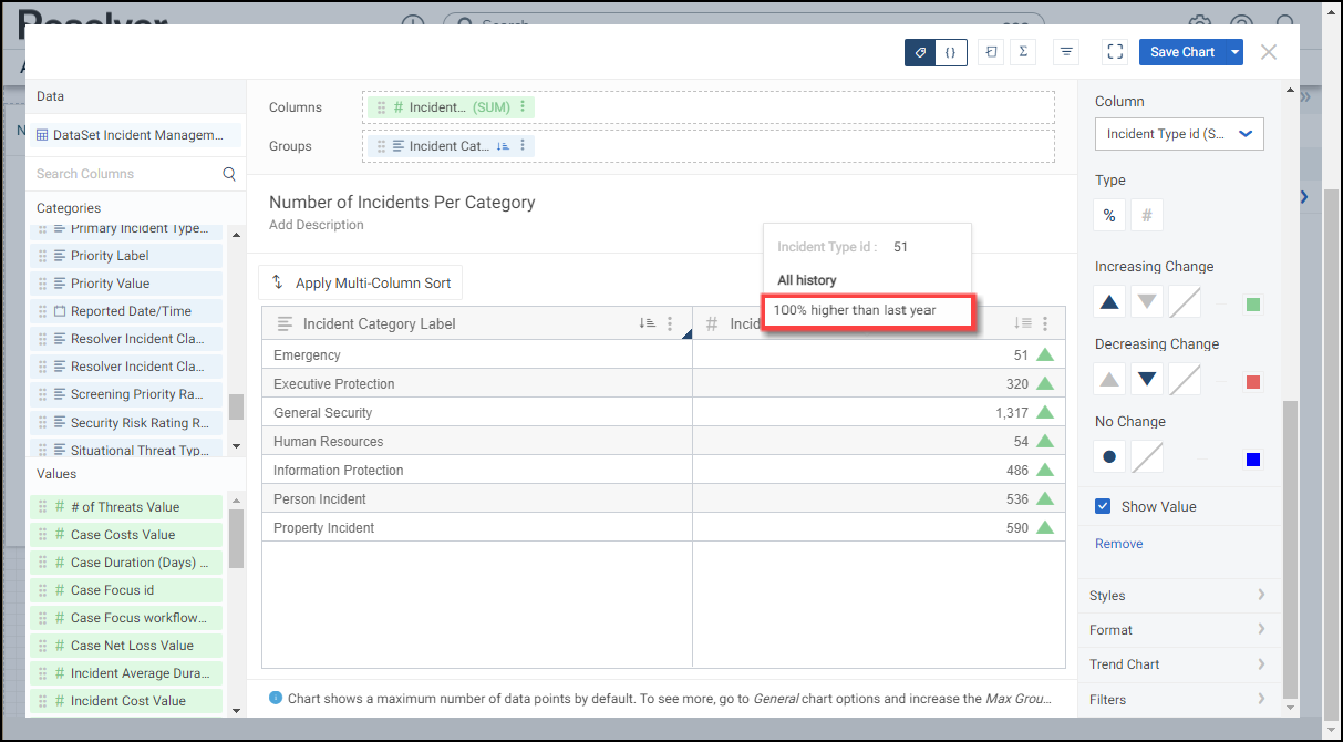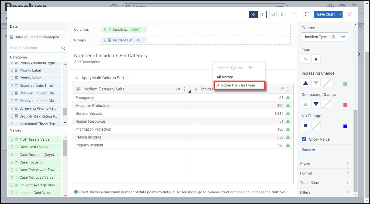- Increasing Change: The Increasing Change field allows users to select the icon (Triangle Up, Triangle Down, or No Icon) and icon color (pick a color from the Color Palette pop-up) used to represent an increase in the Comparison value.