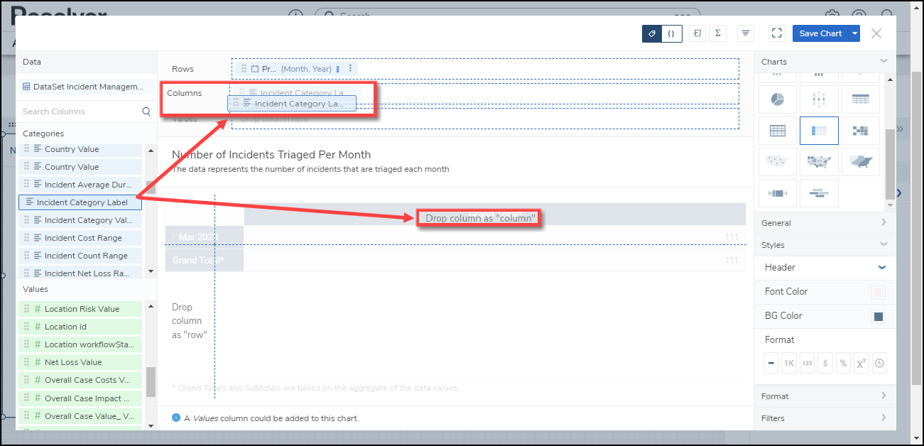 - The Row data will populate the Chart. Data will populate the Chart after adding a Category or Value that has data to the Chart.