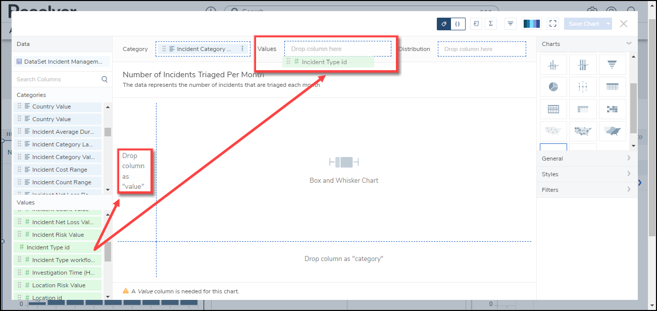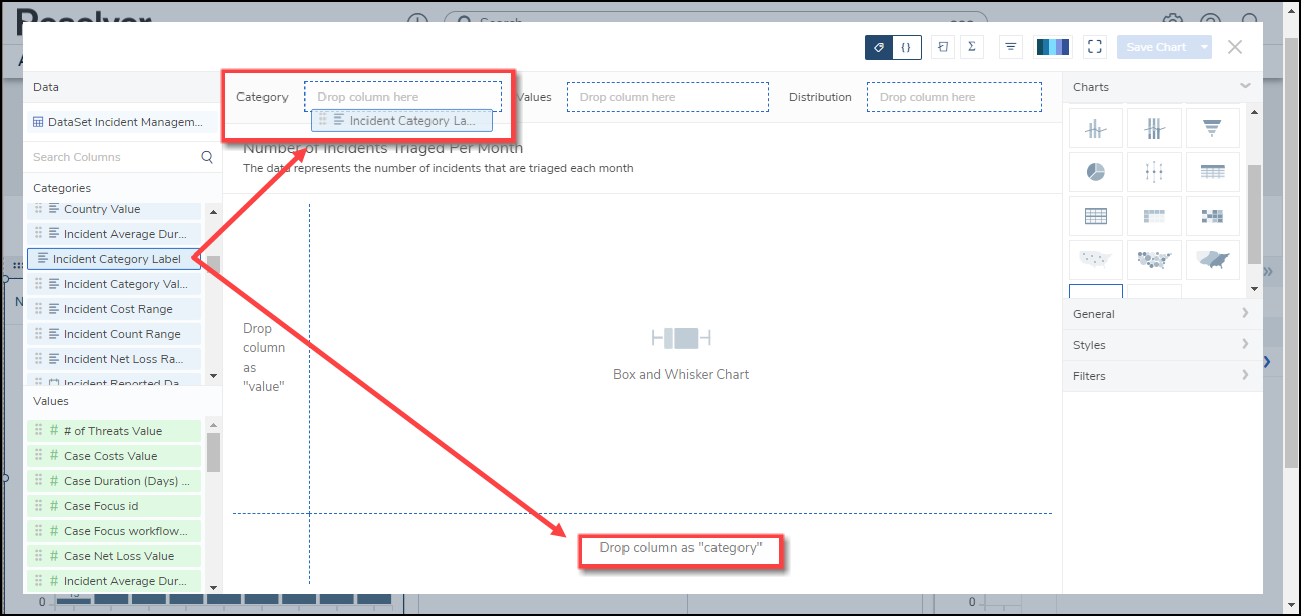 - The Categories, Values, and Distribution (for non-numeric data) data will create the Box and Whiskers Chart in the Dashboard Canvas.