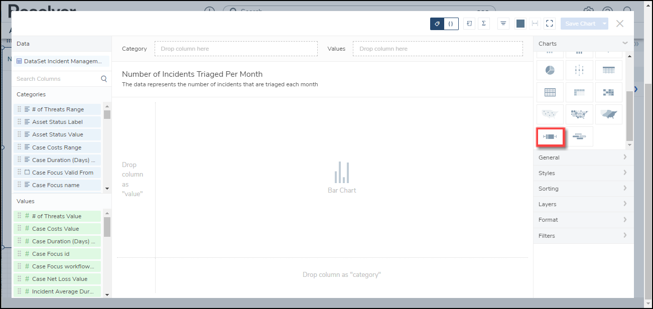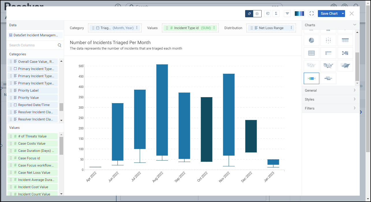 Resolver’s Dashboard Builder allows Administrators to build custom Dashboards using the Dashboard Data Sets published within their Org.